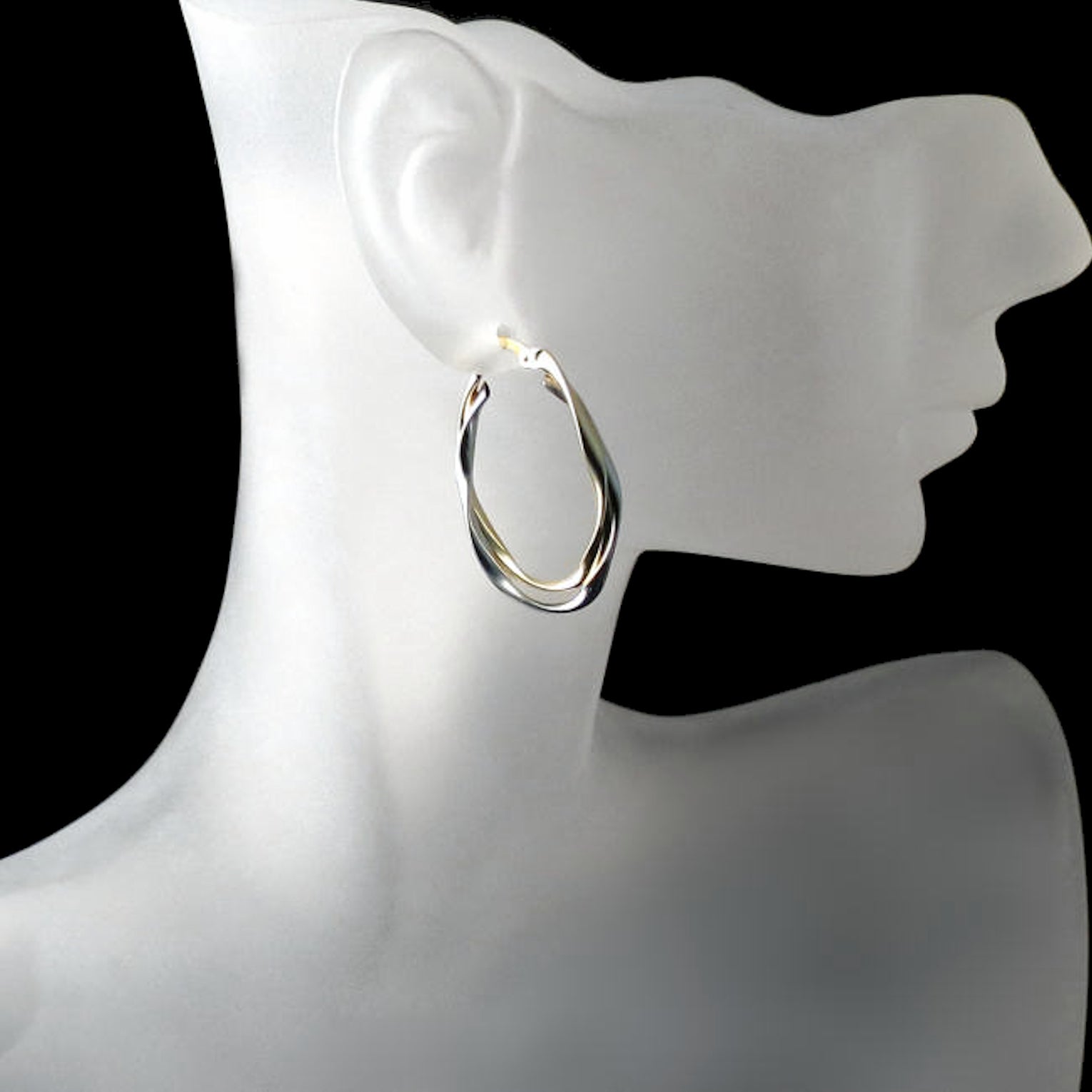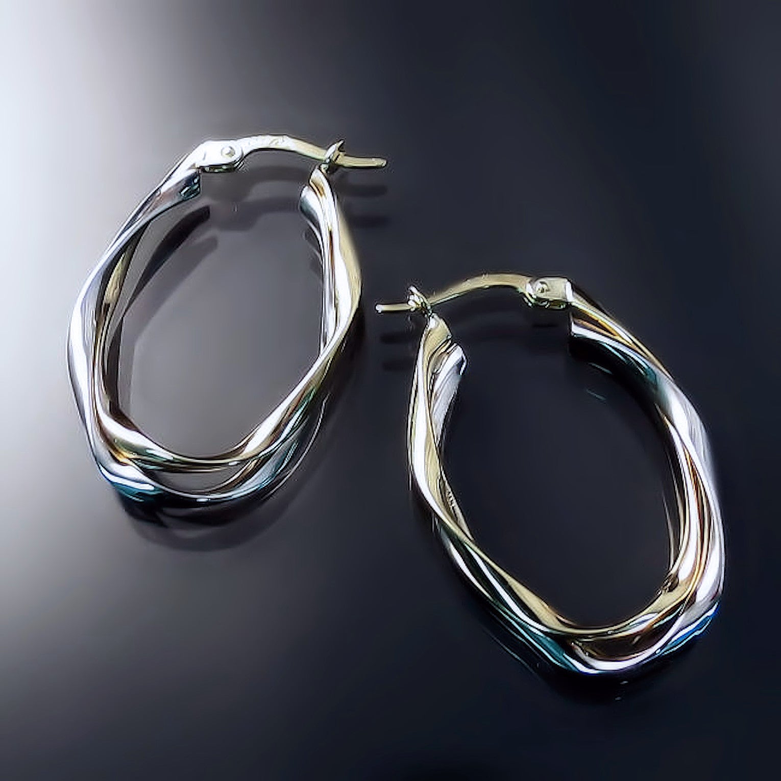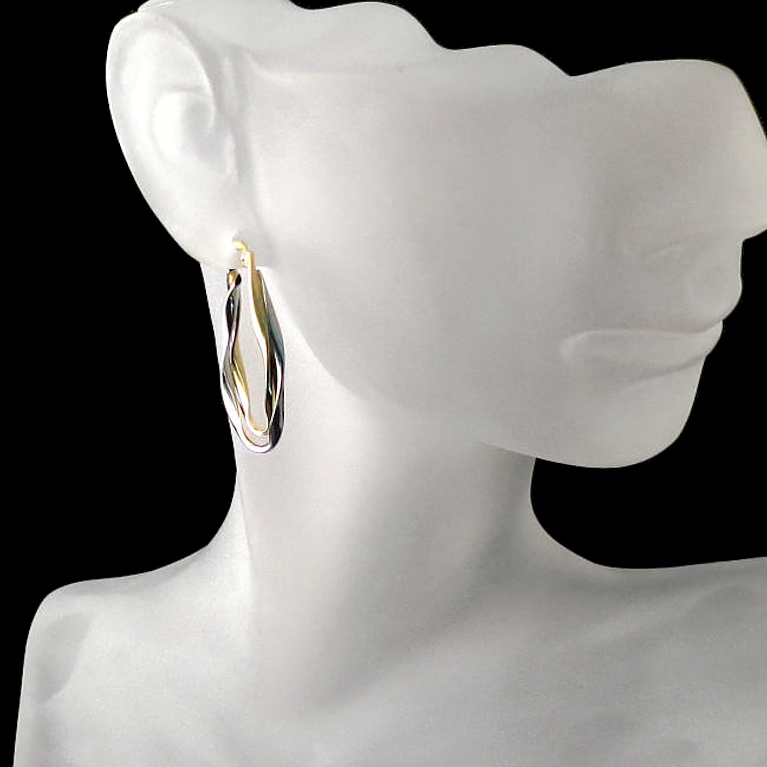 These oblong two tone gold hoop earrings feature overlapping gently twisted ribbon like pieces. Sleek and sophisticated, these hoops will be perfect paired with a business suit or smart casual outfits and minimalist evening wear. Comfortable for all day wear.