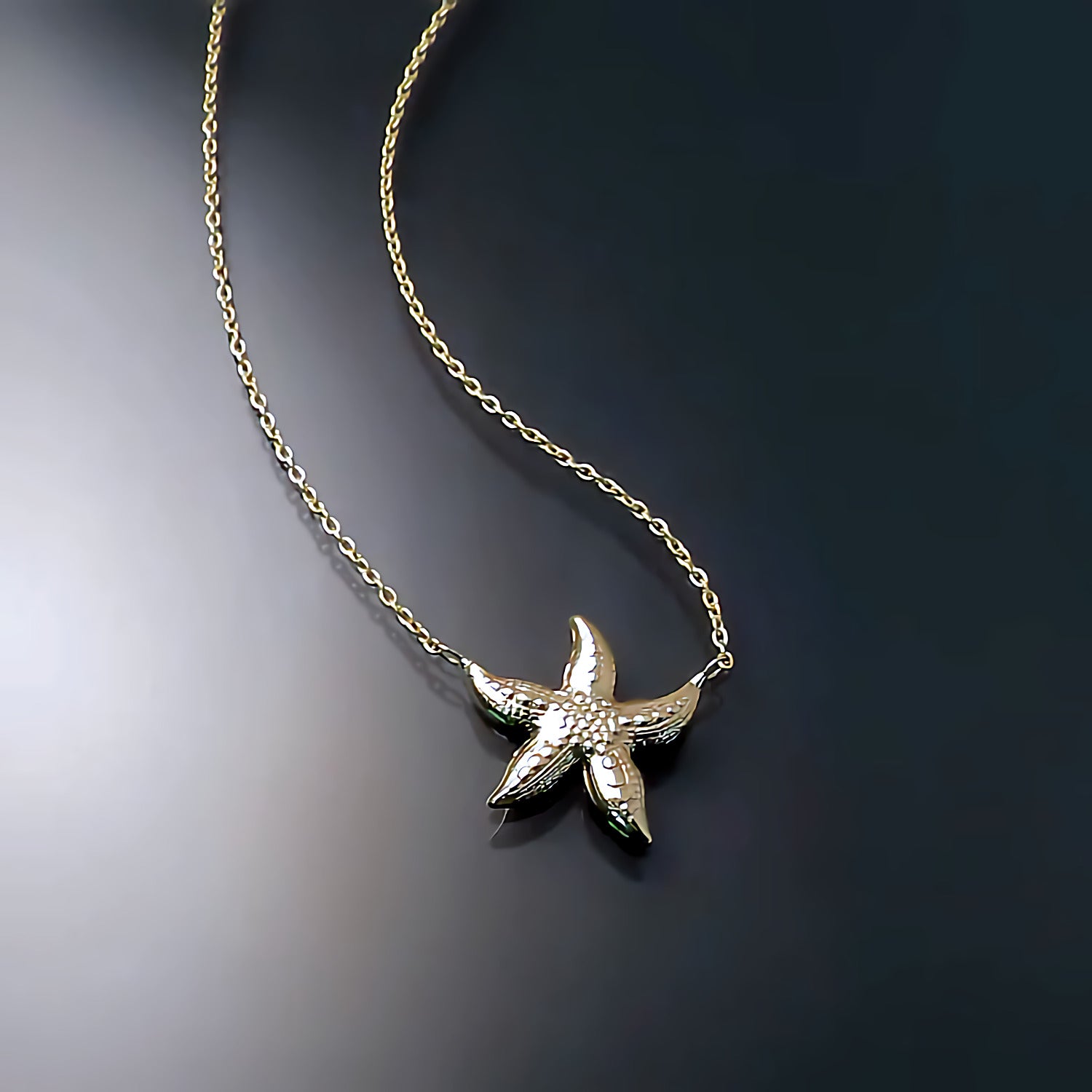 Transport yourself to the tropics at any time with this sweet, yellow gold starfish necklace. The starfish pendant, which is identical front and back, has lovely detailing & texture and is attached from two arms to a pretty, gold chain.