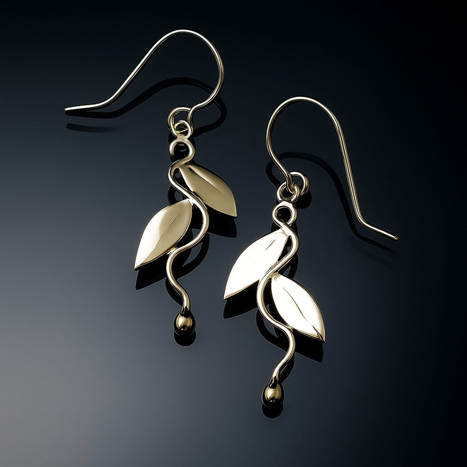 These unique earrings draw inspiration from nature and are reminiscent of leafy vines or birds. Whichever way they are perceived, they are sure to delight with their graceful whimsy and elegant style. These earrings are one of a kind and completely hand forged in solid 14K yellow gold. Fine artisan jewelry for the nature lover.