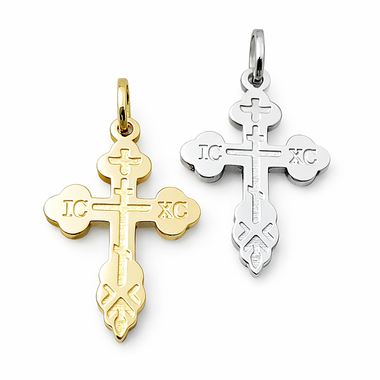 This is the medium size version of our Saint Xenia Orthodox cross. A beautiful cross pendant that is ideal for Greeks, Ukrainians, Serbians, Russians, Romanians or Bulgarians. The design depicts a number of symbols meaningful to the Orthodox Christian faith. The downturned dove represents the Holy Spirit descending from Heaven. The letters IC XC engraved on the arms stand for "Jesus Christ" and the three-armed St. Andrew cross embossed in the center is noted for the bottom slanted bar symbolizing the balance beam of righteousness.