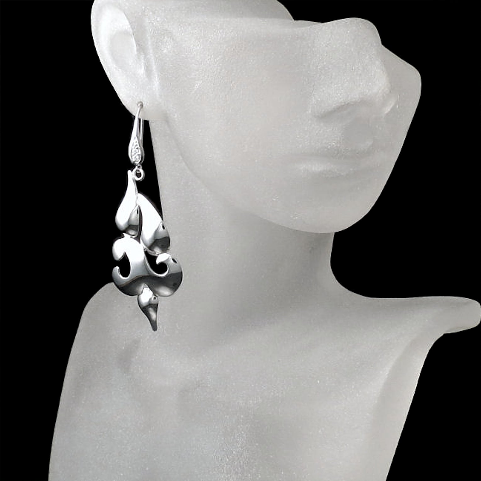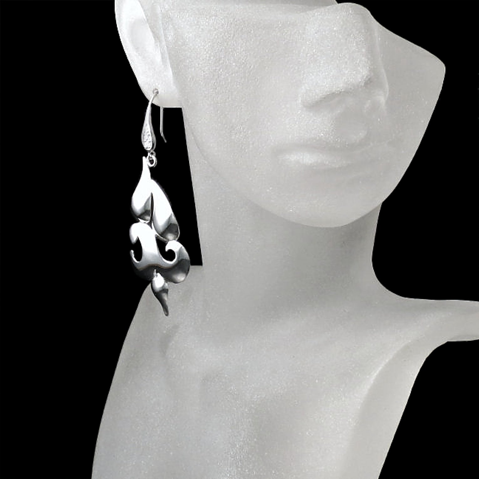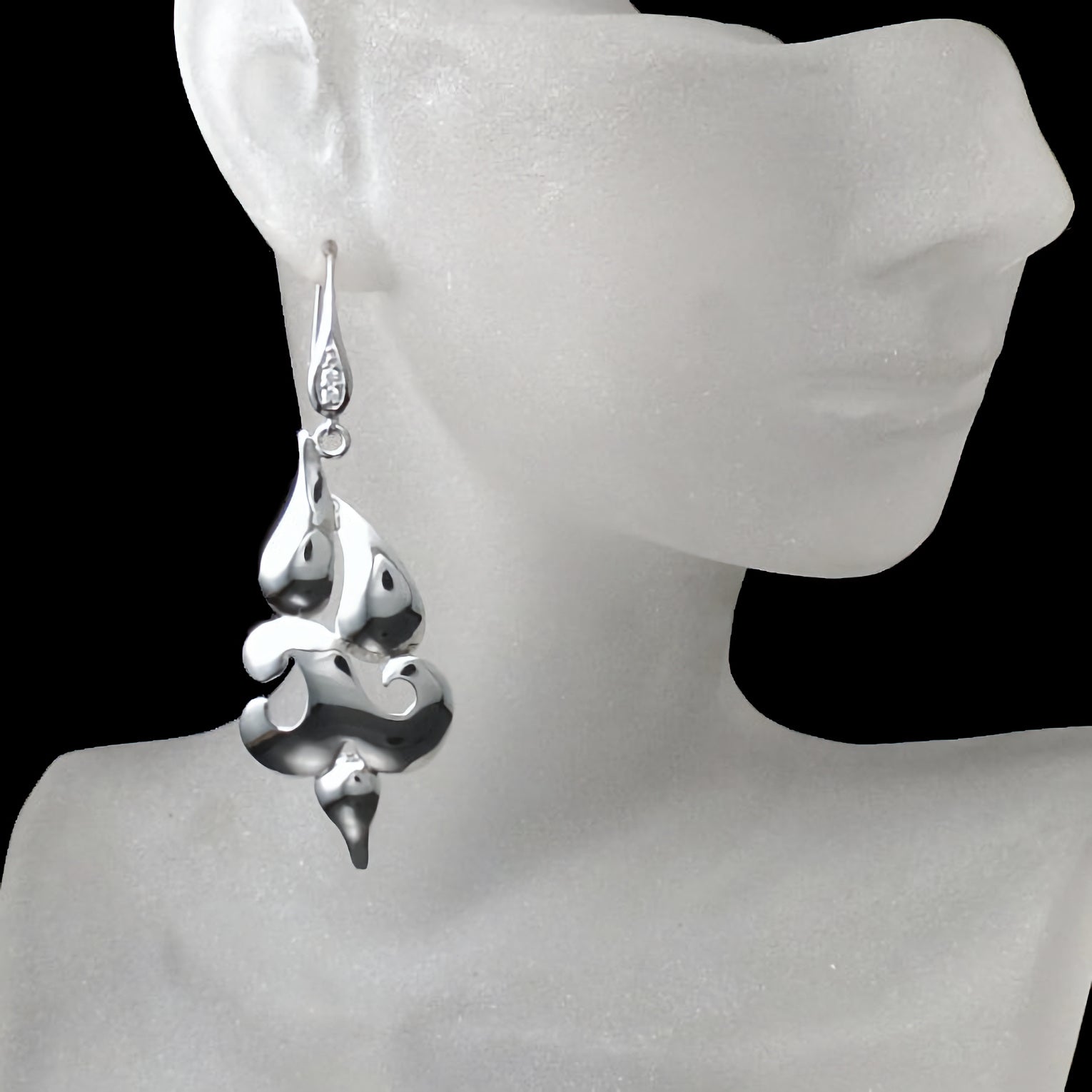 These long, elegant statement earrings are one of a kind creations hand forged in sterling silver and polished to a mirror finish. Striking and unique, they are glamour without the glitz. Fancy ear hooks are set with cubic zirconia for just a hint of sparkle. Unique accessories for effortless sophisticated style.