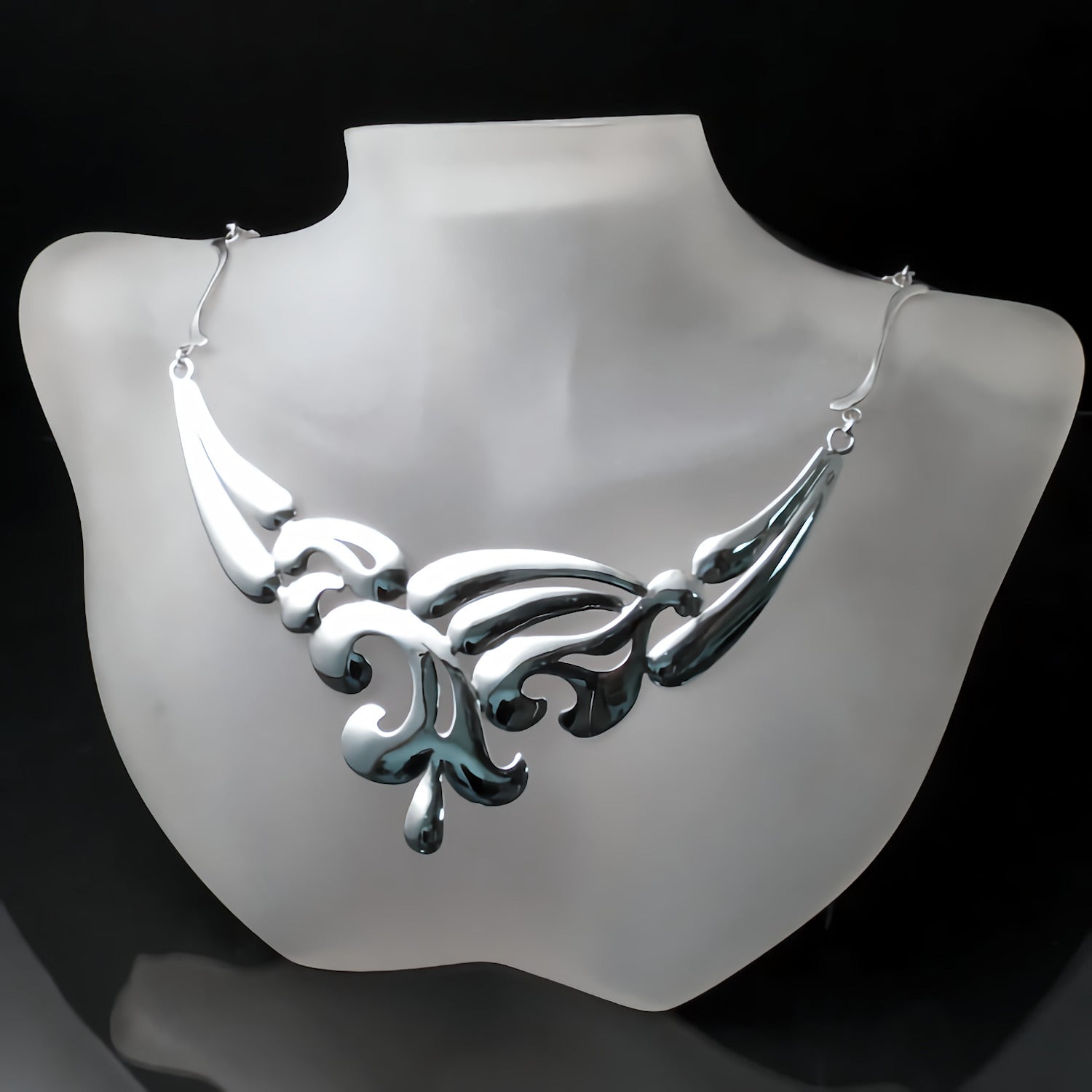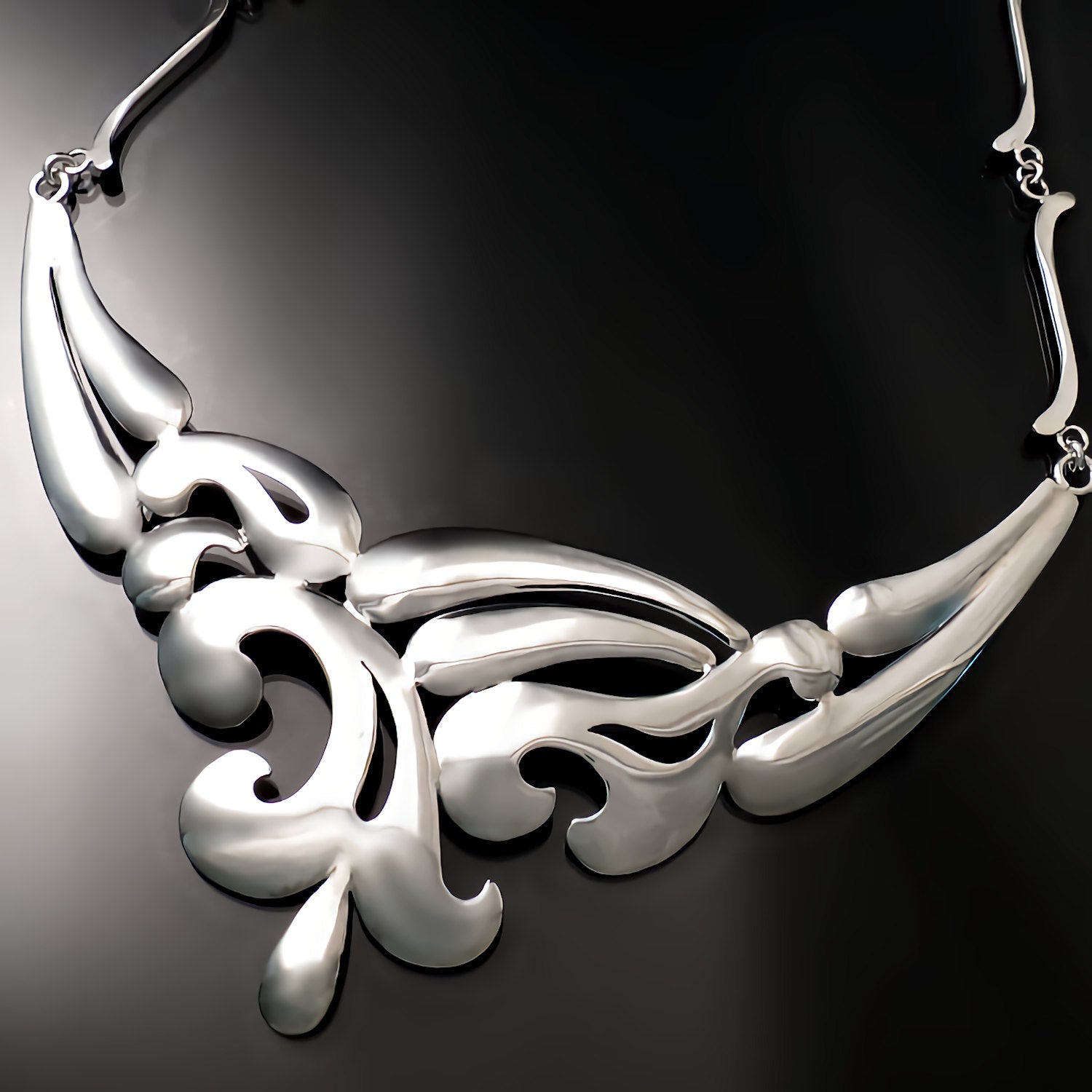 This unique, sterling silver statement necklace will take your breath away. Completely hand forged by a master of his craft; each segment was meticulously cut, contoured and combined into a striking work of wearable art. This is a stunning sculptural piece that will elevate any look to the height of elegance. Glamour without the glitz, it's form and fluidity that give this piece it's sophisticated style.