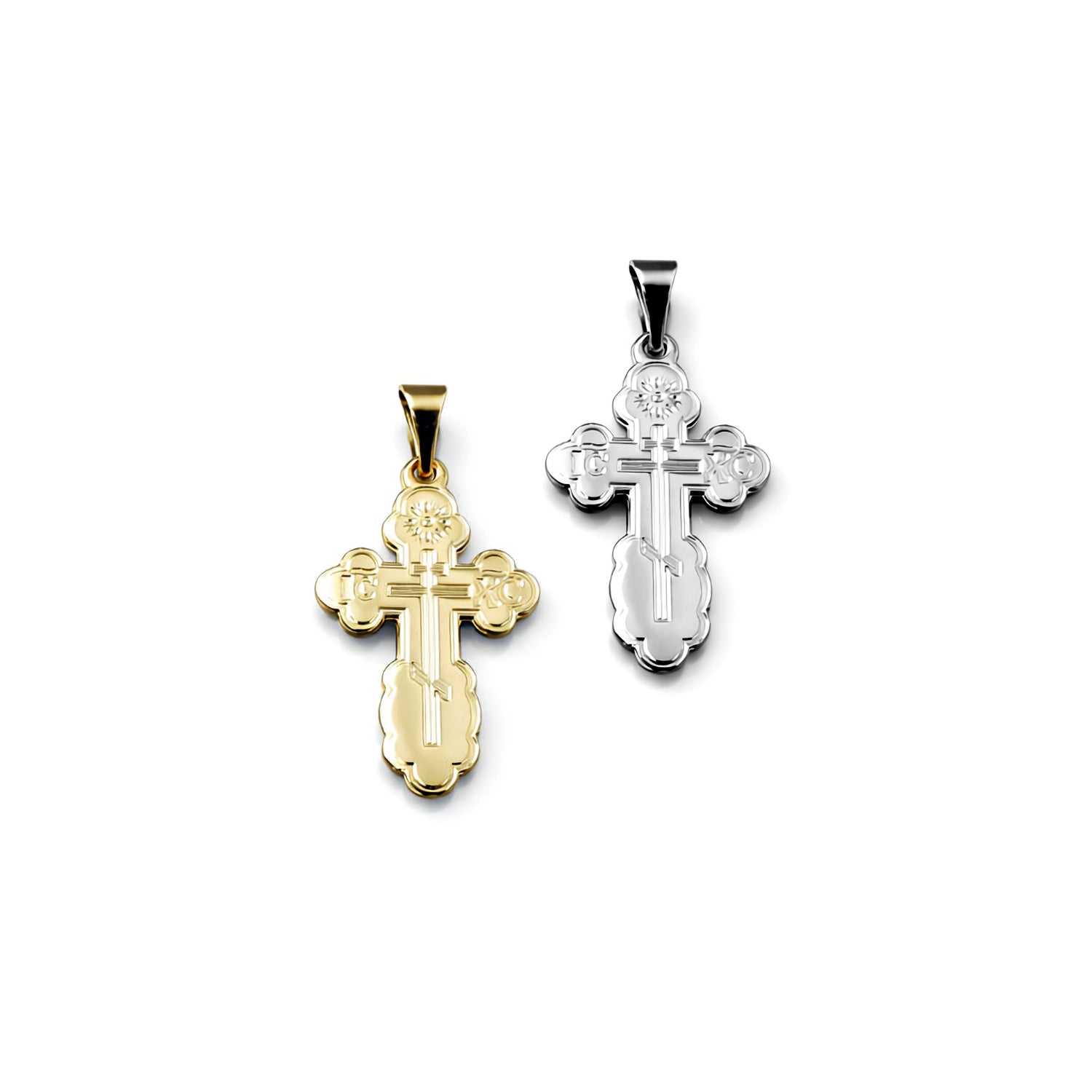 These Orthodox crosses are die struck in solid gold and available in your choice of 14K yellow or 14K white gold.