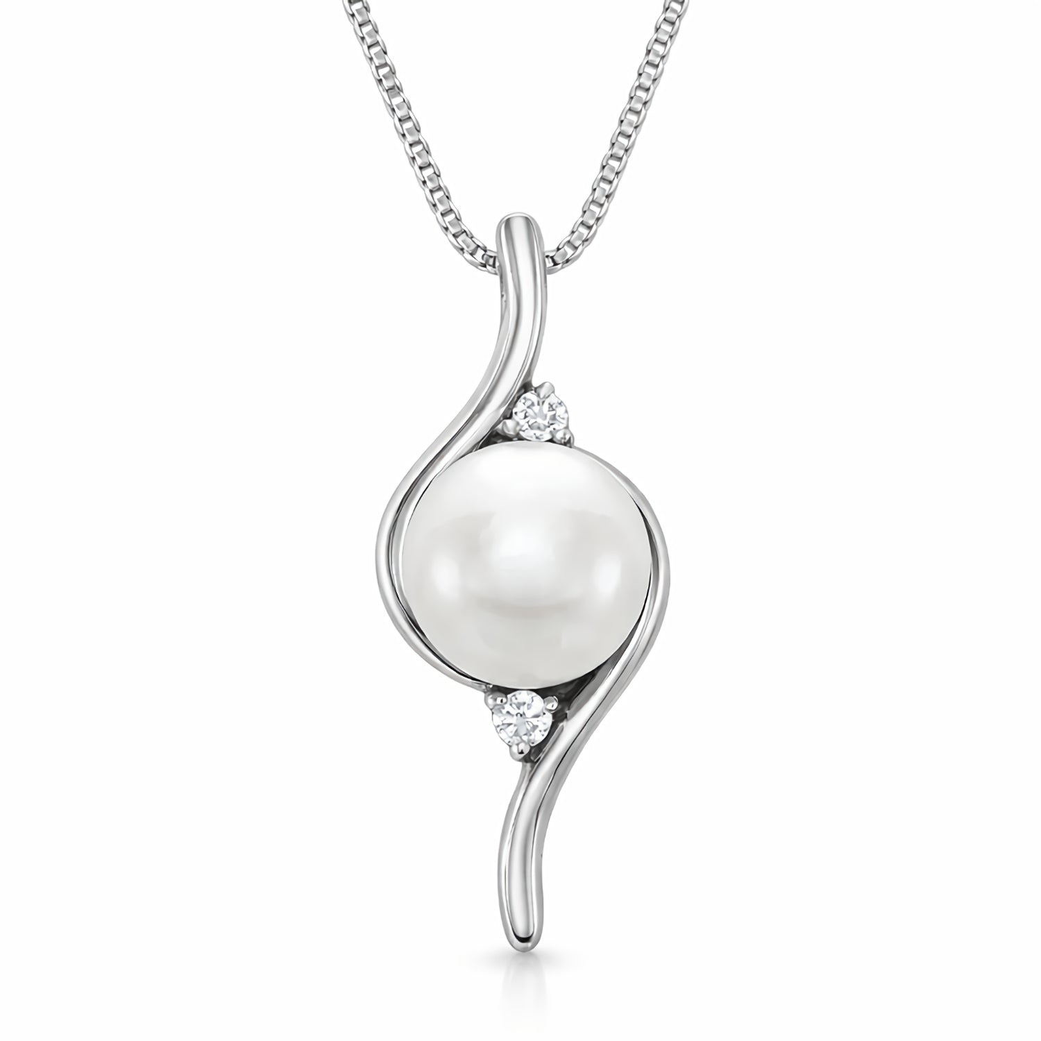 This elegant pearl necklace features a slider pendant set with a lustrous freshwater pearl and accented by 2 small diamonds, all floating on a delicate, box link chain. A classic piece of fine jewelry that couples modern and traditional elements for a timeless design that is at once sweet and sophisticated. Available in 14K white or yellow gold and your choice of 16" or 18" length.