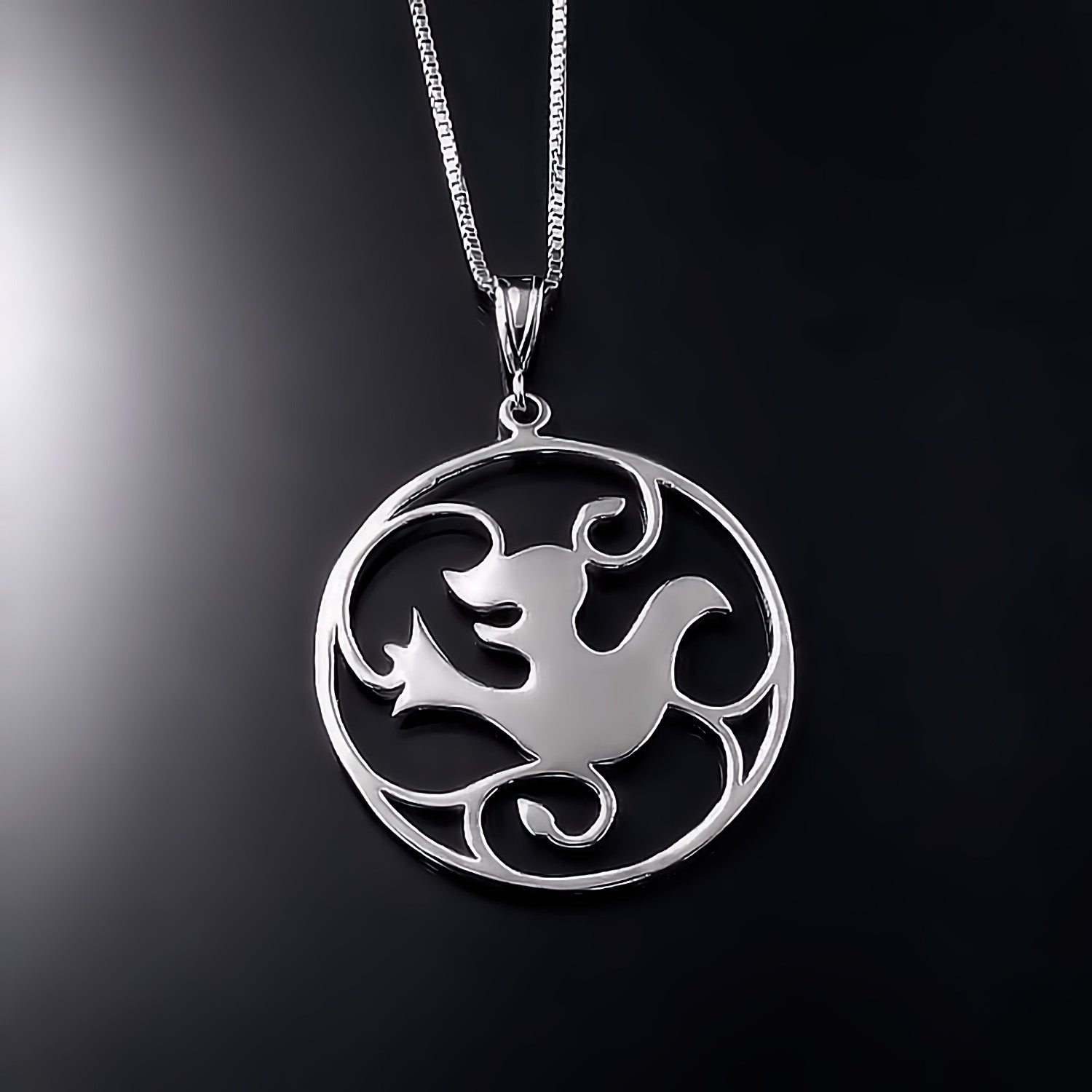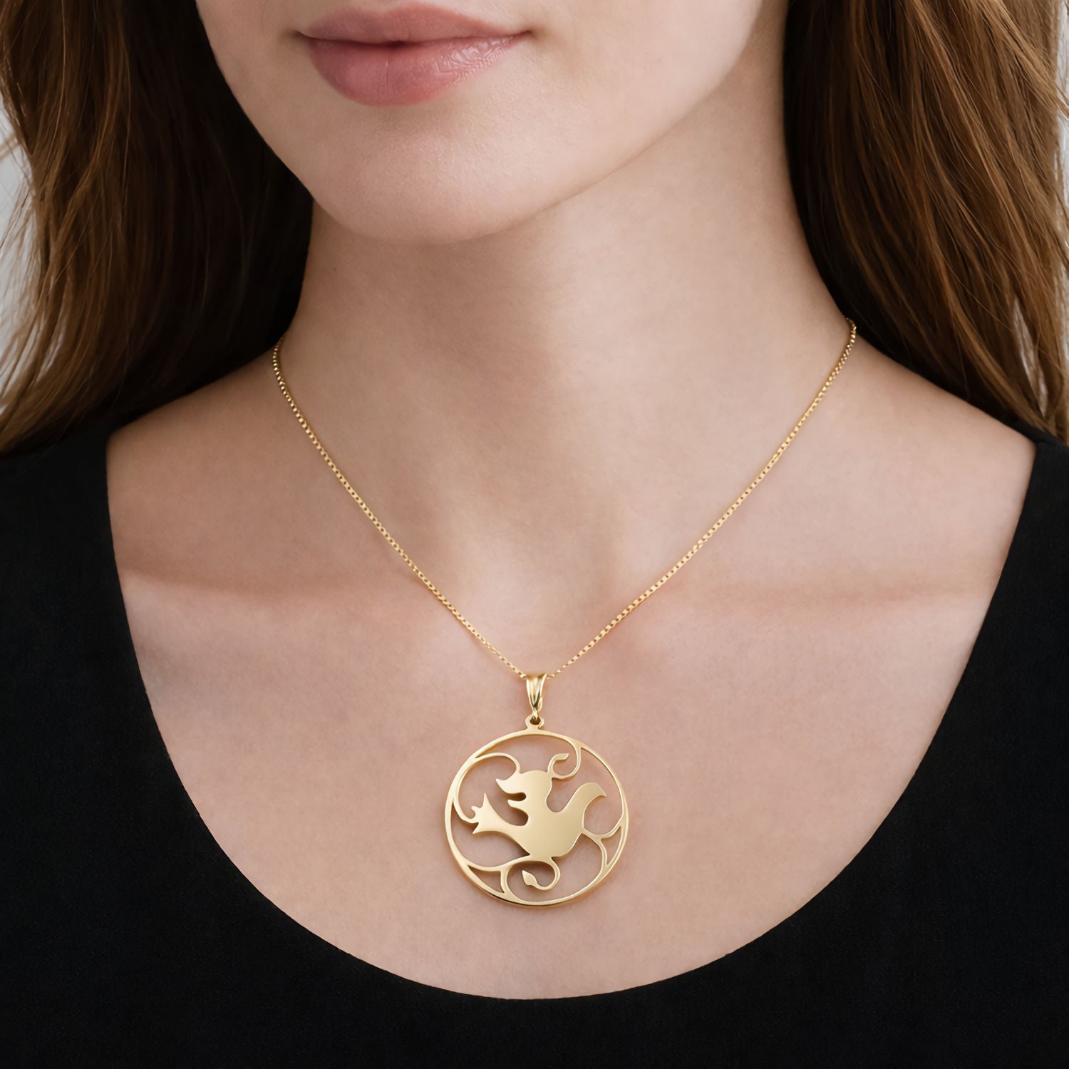A unique and elegant dove pendant in solid 14K gold. A medallion style pendant featuring a beautiful dove surrounded by delicate vines within a circle enclosure. This graceful designer piece is timeless and will never go out of style. A lovely piece that is sure to become a family heirloom.