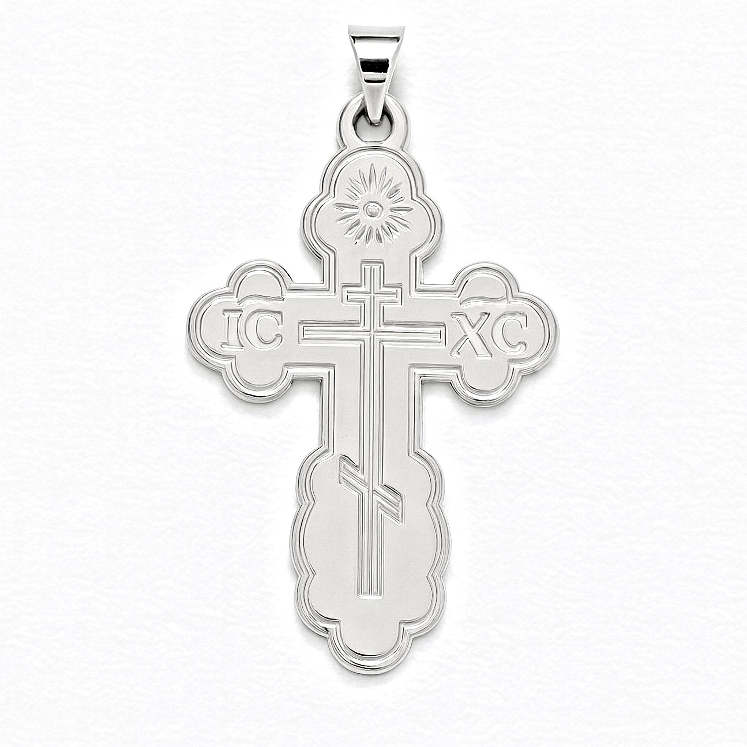 This Orthodox cross is suitable for adults or as a Baptismal gift. It is lighter than some of our other, similarly proportioned St.Olga crosses. As is typical of the Saint Olga cross it includes the sun-like symbol representing the light of Christ at the top, the letters IC XC which stand for "Jesus Christ" and the three-armed St.Andrew cross which is embossed in the center. The back is plain with a matte finish.