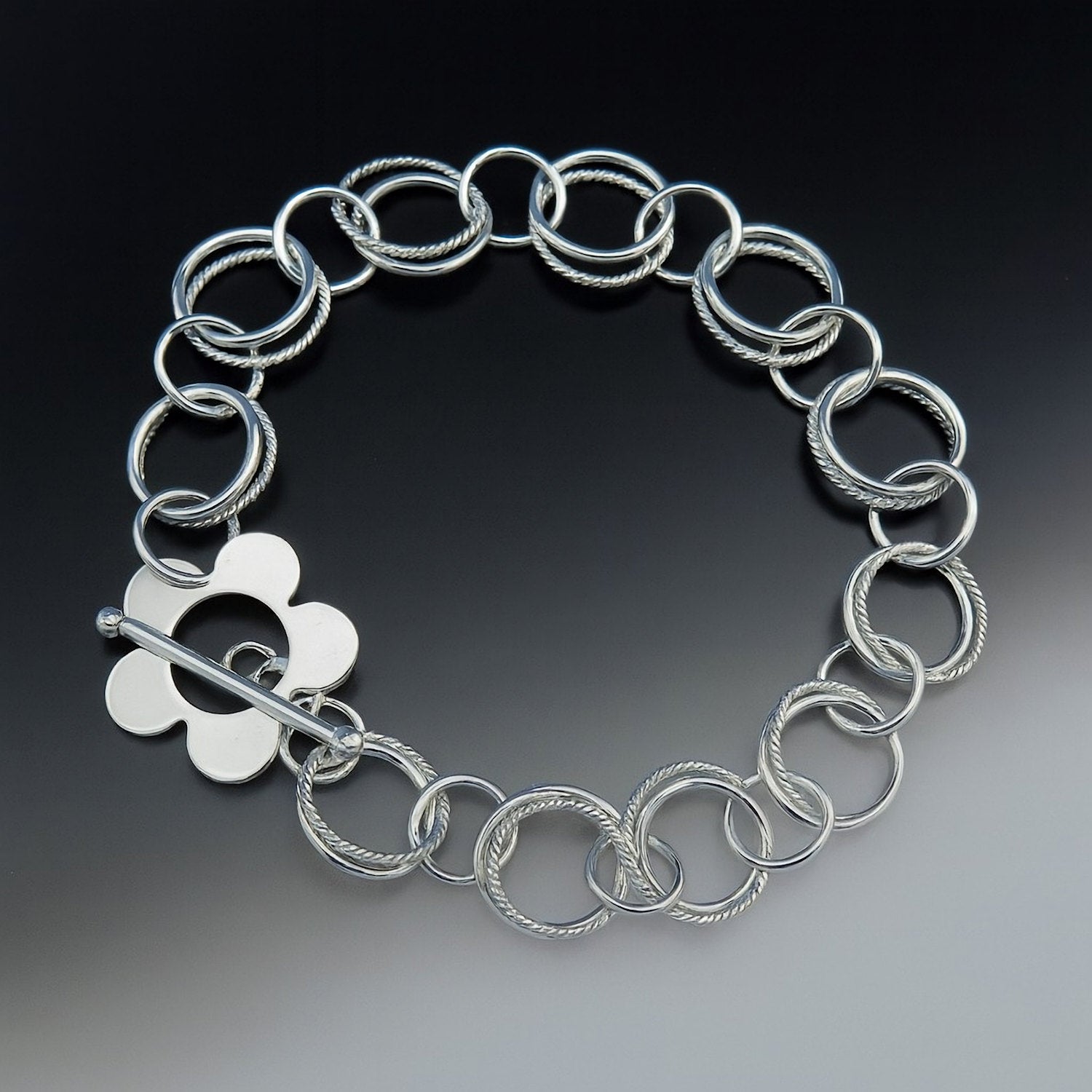 A delightful sterling silver bracelet featuring a darling daisy toggle closure. Makes a sweet and charming gift. Made to order in 6.5, 7, 7.5, 8, or 8.5 inch lengths (please specify your desired length choice in the "Note to Zoran Designs" section once you add item to cart).