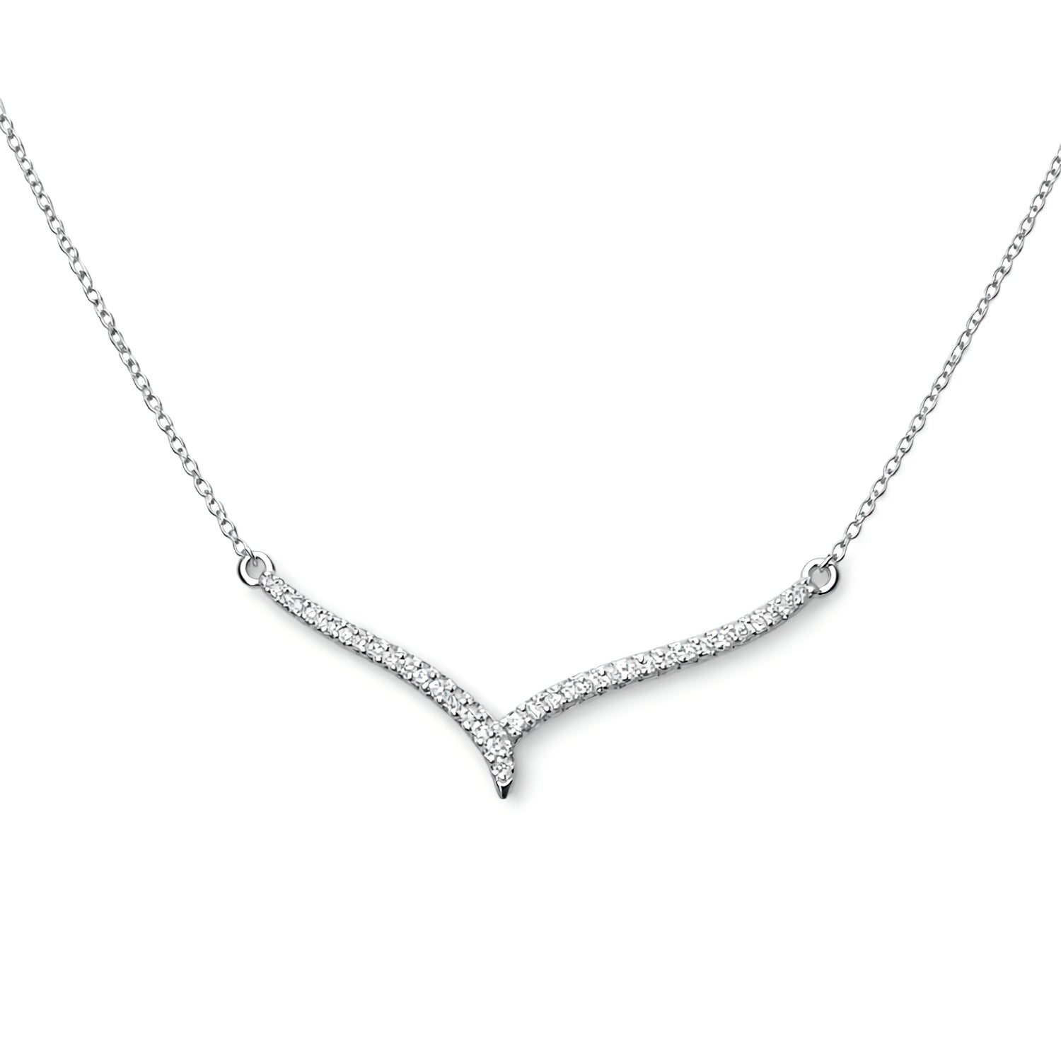 This 'V' bar diamond necklace features a graceful silhouette that will add elegance and charm to your everyday style. Crafted in 14K white gold and set with approximately 0.17 carats of sparkling, natural diamonds that enhance the feminine, soft V shape of the centerpiece. You'll love how this pretty necklace goes with everything. Wear as either 16, 17, or 18 inch length by doing up at different points along the chain.