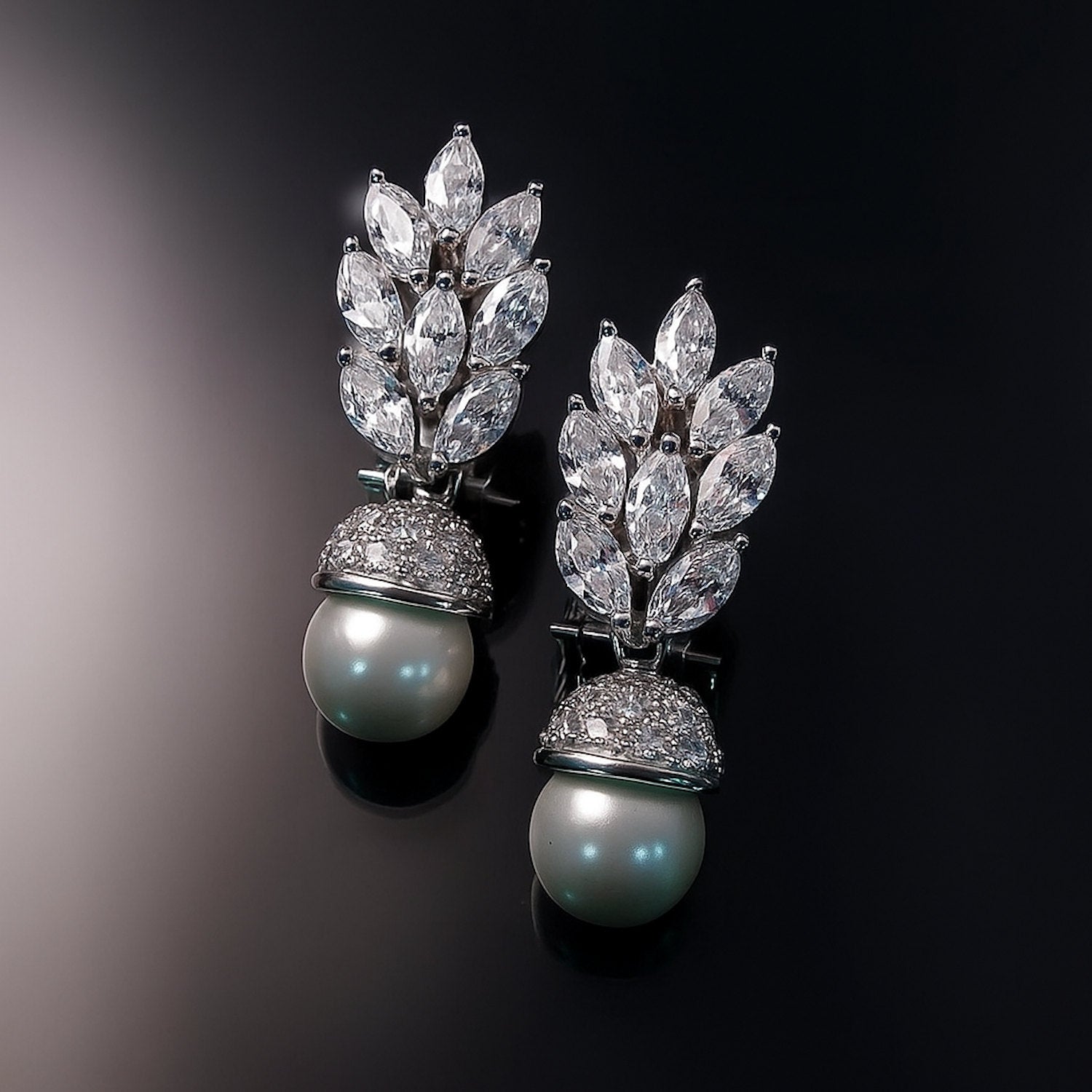 These show-stopping, vintage inspired earrings are a throwback to old Hollywood glamour. Featuring sparkling marquise shaped Cubic Zirconia and a 10mm simulation pearl in a CZ crusted dome. Ornate details and stunning, unique design make these stand-out earrings ideal for brides, mothers of the bride/groom or anyone looking for affordable special occasion jewelry. Omega back ensures all day comfort.